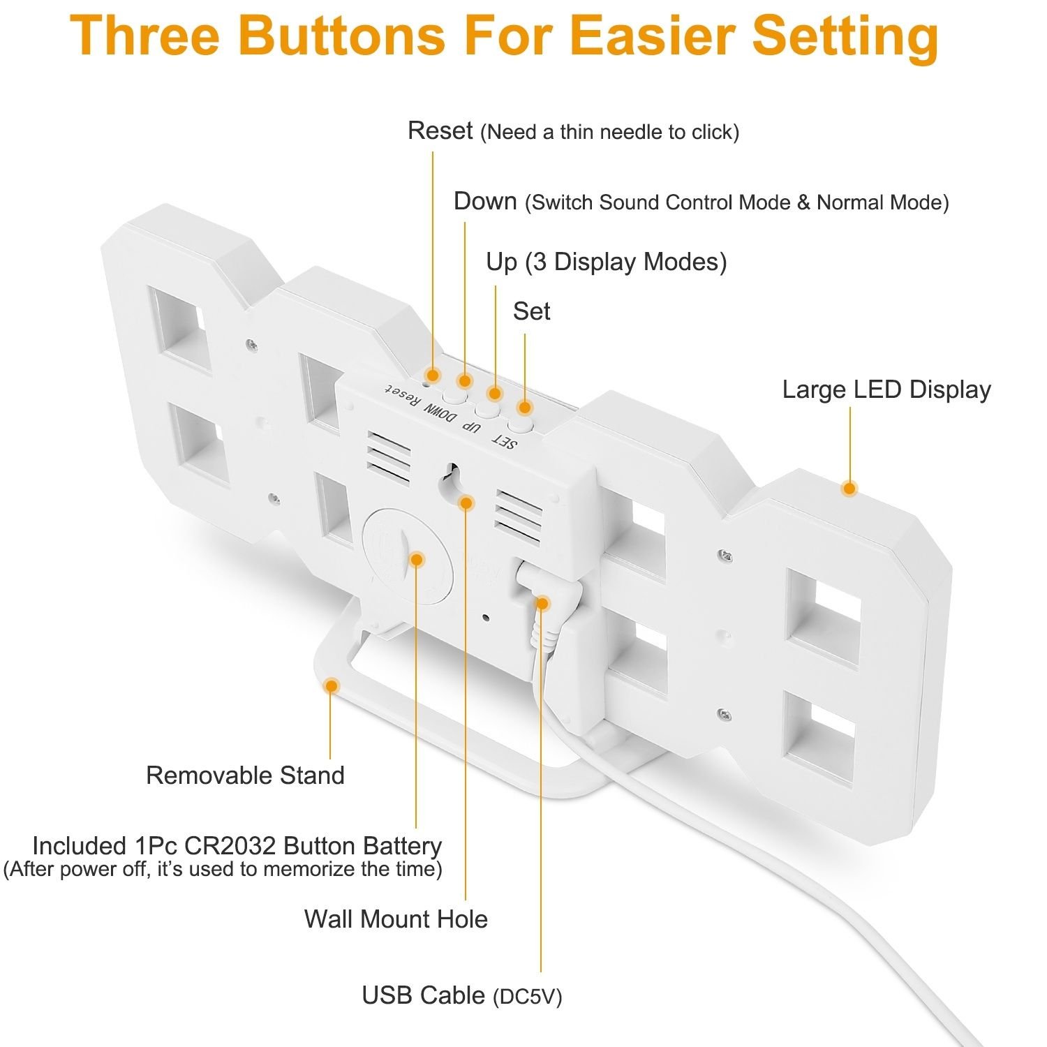 Home > 3D LED Digital Wall Clock Sound Control Table Desk Alarm Clock w/ 3 Auto Adjustable Brightness Snooze