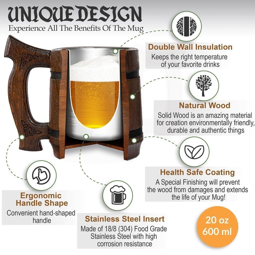 1.handmade beer mug: each 20 oz viking cup is made from natural hardwood. an authentic wood grain gives the beer mugs a natural look ensuring that each one is unique.