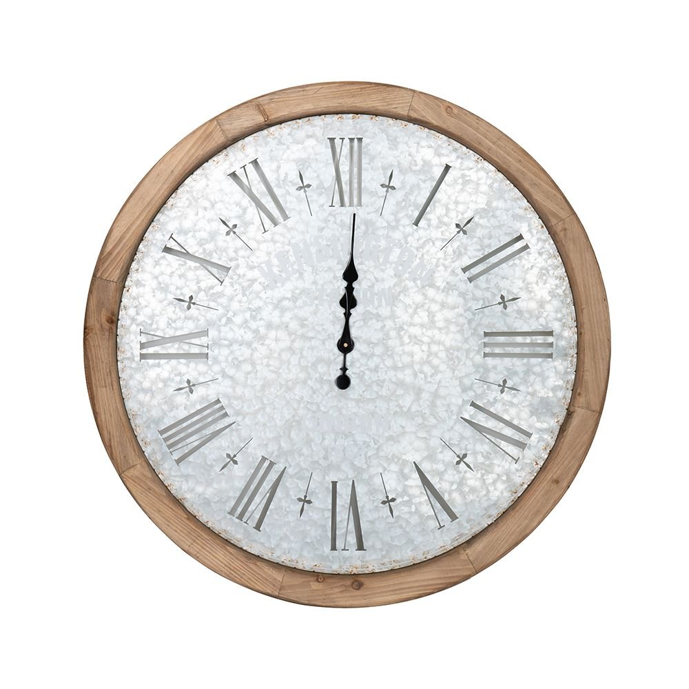 At over two feet in diameter, this oversized rustic wall clock features large numerals cut from galvanized metal and a wooden frame in a natural finish.