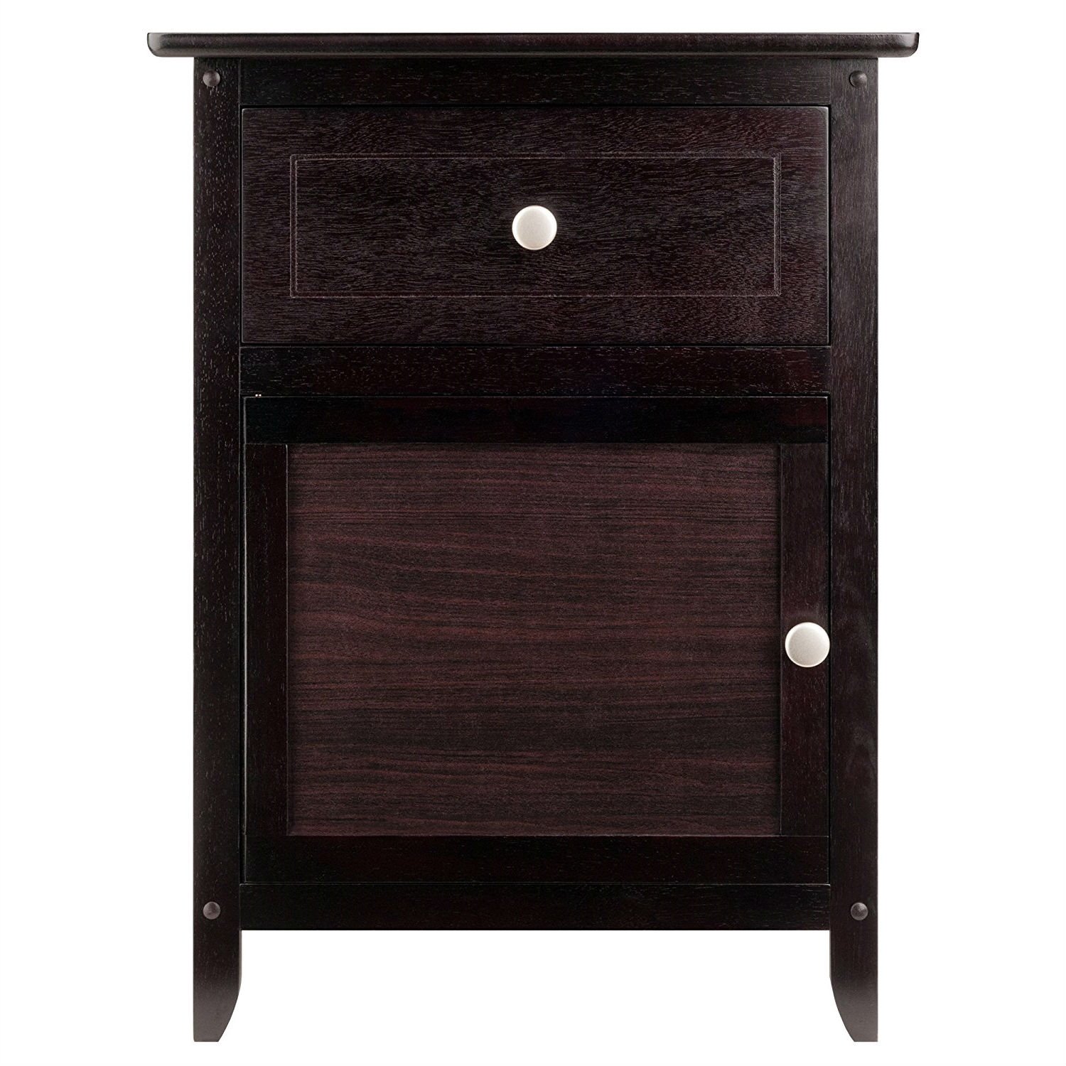 Tuck remote controls and drink coasters inside the drawer of this Espresso Wood End Table Nightstand Accent Table. With its clean lines, slightly tapered legs, and uncomplicated design, the table fits easily into traditional and more modern interiors alike. Set the table next to a sofa in the living room, or use as a night stand with a lamp placed on top. The table is crafted out of wood/composite with a warm espresso finish. For storage, the table offers a small drawer and a single-shelf cabinet. Both the drawer and the cabinet door provide a round satin nickel knob for opening and closing; the cabinet’s hinges are pre-installed on the right side of the door to swing open from left to right only. Upon delivery, the table requires home assembly and comes with necessary hardware and tools. The assembled table measures 19 inches wide by 15 inches deep by 25 inches high. This item weighs 21 pounds upon shipping.