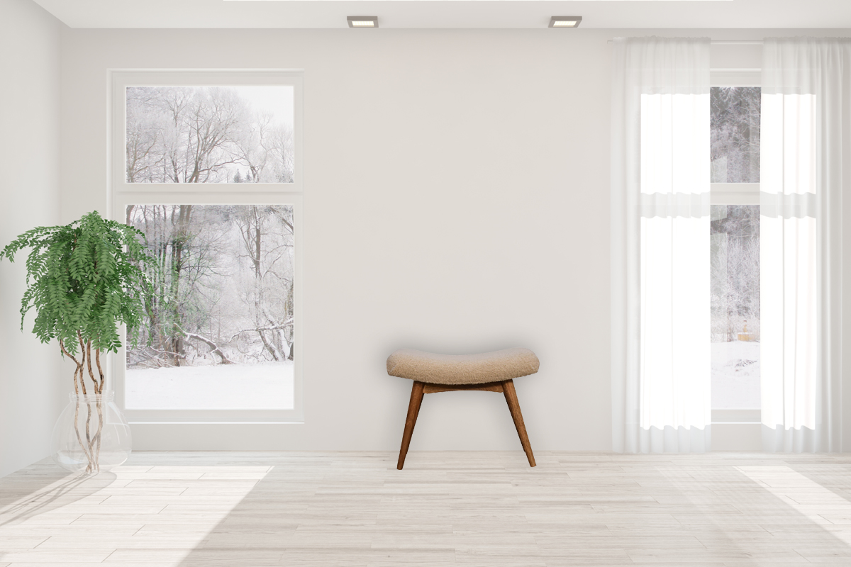 Derived from the French word for 'curled' or 'ringed' yarn or fabric. This handwoven upholstered furniture piece is made of 100% cotton and natural yarn. Our Nordic-style benches will provide you will style and versatility. This stunning curved bench has been upholstered in a lovely boucle fabric and stands on 4 Nordic style legs constructed from 100% solid mango wood in an oak-ish finish. This piece can be used in a hallway or as additional sitting in your bedroom, or living room.
