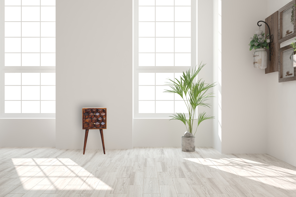 This beautifully designed nightstand is constructed from 100% solid mango wood and has a fine chestnut finish. It features 2 small cube-carved drawers giving the piece extra character and dimension. It has 4 Scandinavian-style legs to modernize your home and can be fitted in tight compact spaces to go in any type of home interior. This petite product is a part of Recession Collection.