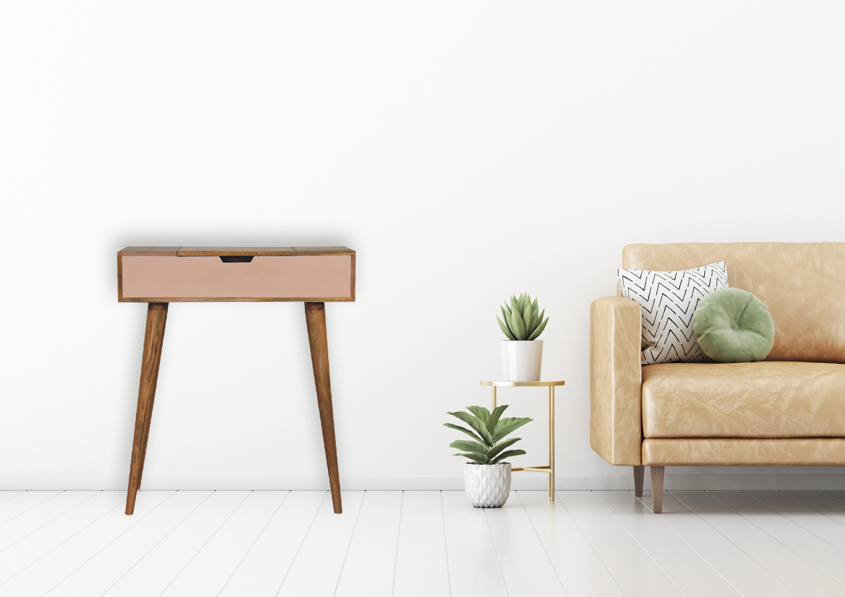 Add this beautiful dressing table to your home. Constructed from 100% solid mango wood in an Oak ish finish with 1 blush pink drawer, it features a foldable mirror and storage compartments for storing any bits and pieces. Other product features - include Nordic-style legs and a cutout slot for easy access into the drawer. A lovely versatile piece that will complement any room beautifully. This petite product is part of Recession Collection.