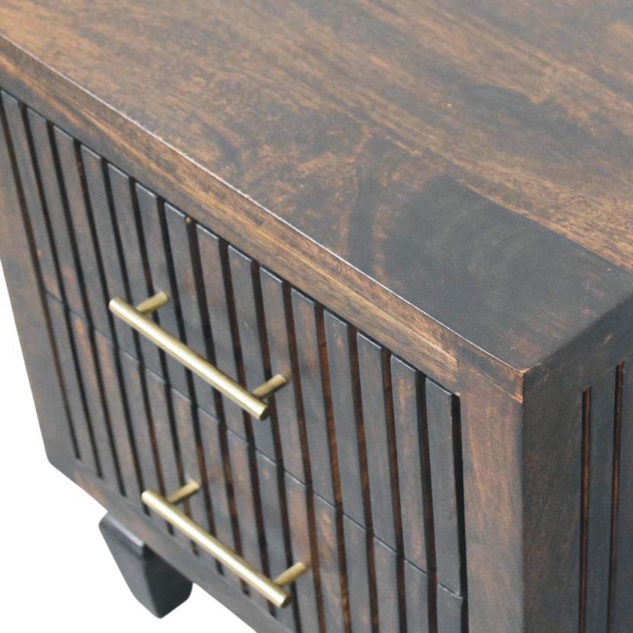 The Belmont 2 Drawer Nightstand offers a bold blend of texture and tone, handcrafted from 100% solid mango wood in a rich Velvet Mocha finish. Its vertically fluted drawer fronts and turned legs create a stately silhouette, while the brass-toned handles add a refined contrast. With two spacious drawers, this piece brings both elegance and practicality to your bedroom, making it a timeless addition to modern and traditional interiors alike.