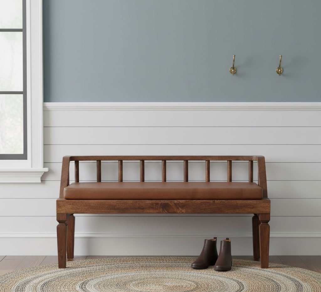 The Bordeaux Leather Bench combines rustic warmth with modern simplicity. Handcrafted from solid mango wood in a soft roasted almond finish, it is topped with a rich brown leather cushion that adds comfort and timeless charm. Its clean lines and gently tapered legs give it a versatile character, making it equally suited for entryways, living rooms, or at the foot of the bed. This piece balances natural textures with understated elegance, creating a seating solution that is as functional as it is refined.