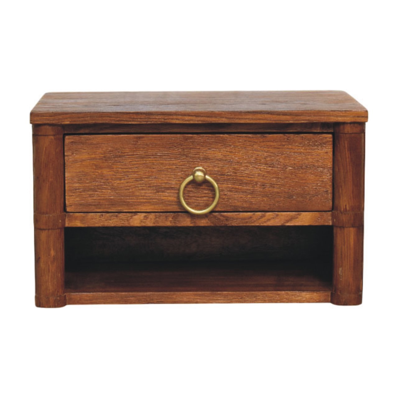 Expertly handcrafted from oak wood in a warm Tiger Oak finish, this wall-mounted nightstand combines sleek geometry with practical elegance. Its boxy frame is balanced by rounded corners and subtle detailing, featuring a single drawer with a classic brass ring pull and an open lower shelf for everyday essentials. Ideal for compact bedrooms or minimal interiors, this nightstand saves space while elevating the room with artisanal craftsmanship.