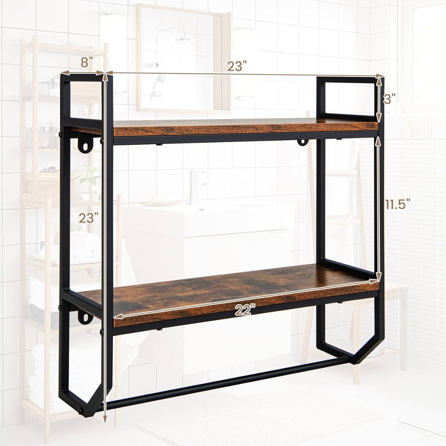 Including 2 open storage shelves, this Wall Mounted Over Toilet 2-Shelf Bathroom Shelving Unit with Towel Bar boasts ample storage space for various bathroom necessities. Moreover, the wall mounted design makes full use of the wall space. The 2-tier bathroom shelf is designed with a round metal towel rack. With a length of 22", it is convenient to hang clothes, towels or other objects. Made of high quality material, the industrial wall storage rack promises to accompany you for years. Additionally, the sturdy and rustproof metal frame offers firm support and each shelf holds up to 44 lbs. This 2-tier wall mounted bathroom shelf features an industrial outlook that matches varying home styles. What's more, it can be widely applied in the bathroom, living room or kitchen to add storage space. Coming with clear instruction, the rustic towel rack with shelf is easy to assemble. The predrilled holes simplify installation. By the way, the smooth and waterproof surface renders maintenance a breeze with a clean rag.