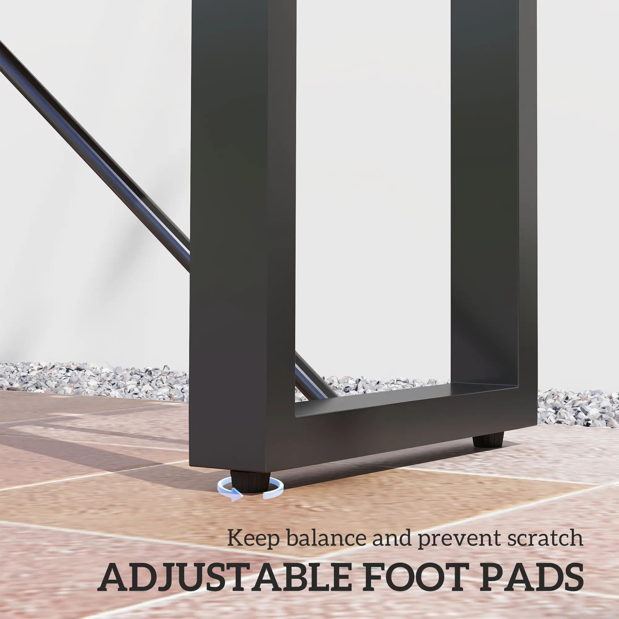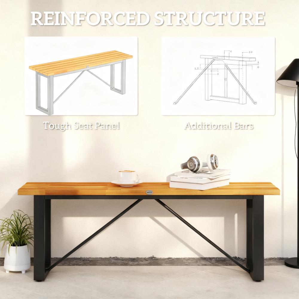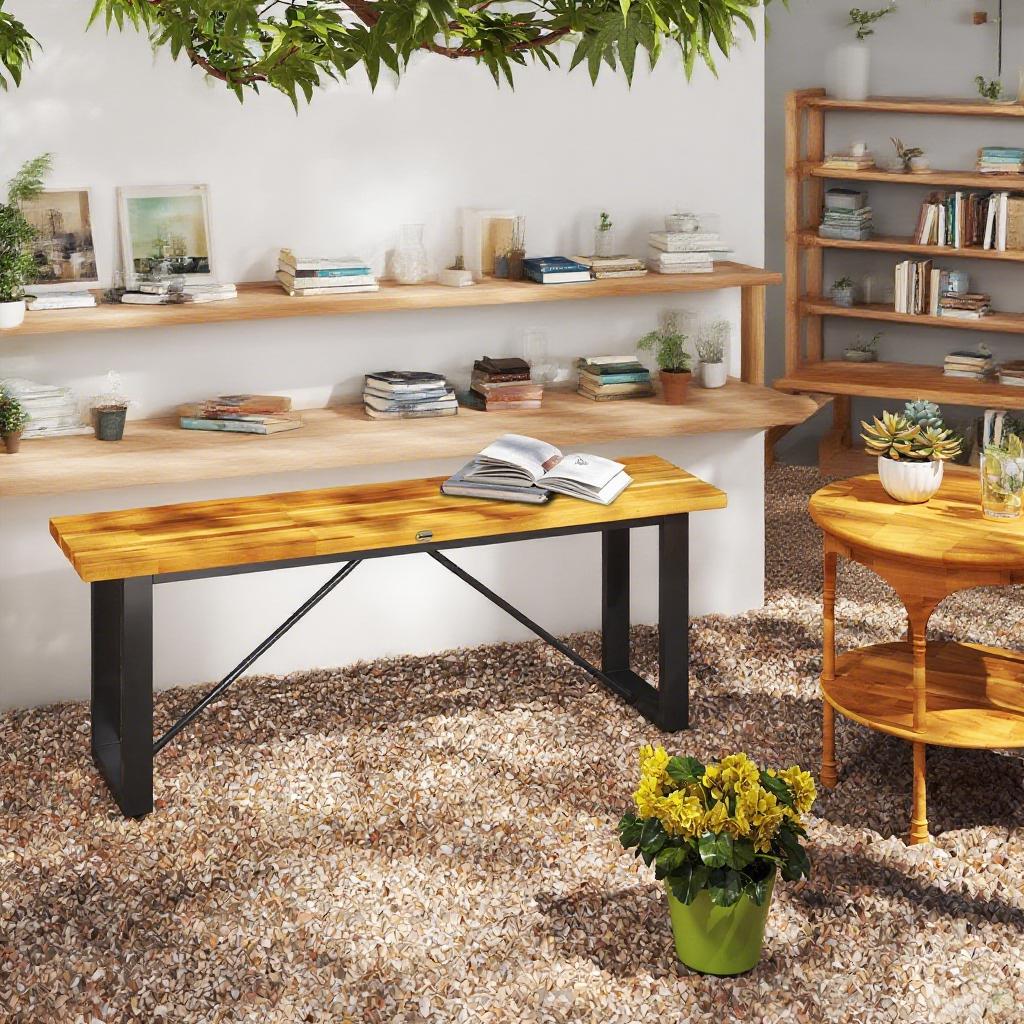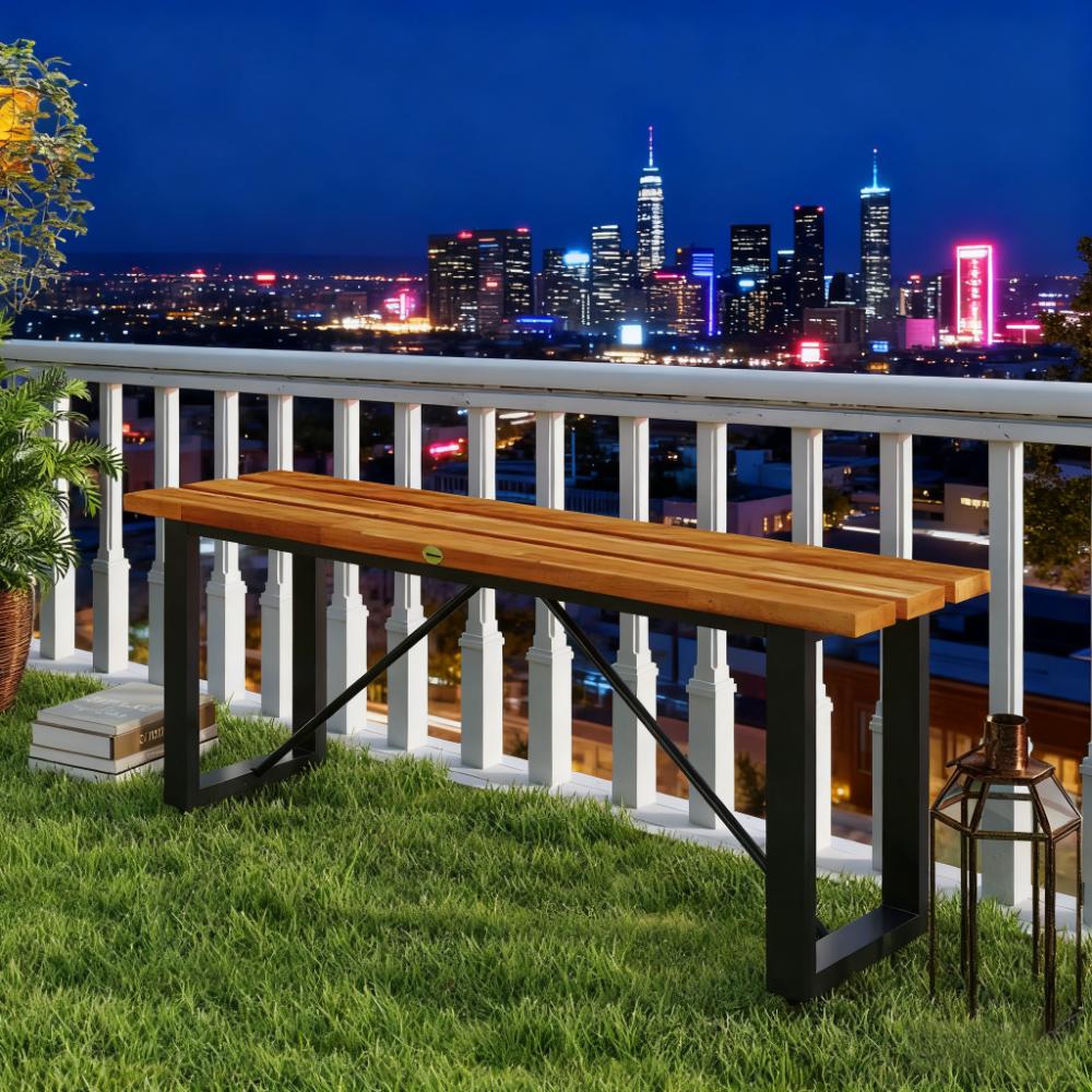 Features: - Two-seater outdoor bench for two people - Varnished acacia wood bench withstandss bending and corrosion - Slatted seat prevents water build-up and lets wood shed moisture - Steel base with reinforced bars provides stable support - Adjustable foot pads enhance balance on uneven surfaces - Timeless, rustic esthetic to bring atmosphere to your outdoor space - The outdoor garden bench is a great fit for the patio, park, porch, etc. - Easy assembly required Specification: - Color: Teak, Black - Material: Acacia Wood, Steel - Overall Dimensions: 47.2" L x 11.8" W x 17.3" H - Slat Dimensions: 3.3" W x 1" D - Weight Capacity: 528 lbs. Package Includes: - 1 x Outdoor Bench - 1 x Manual