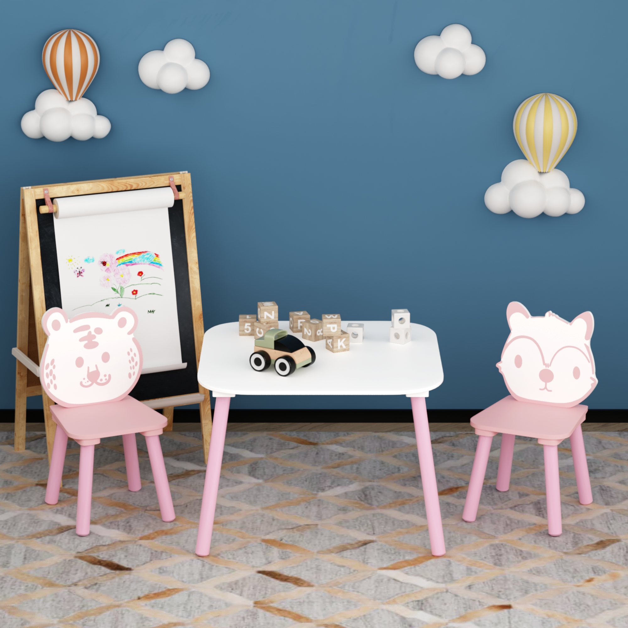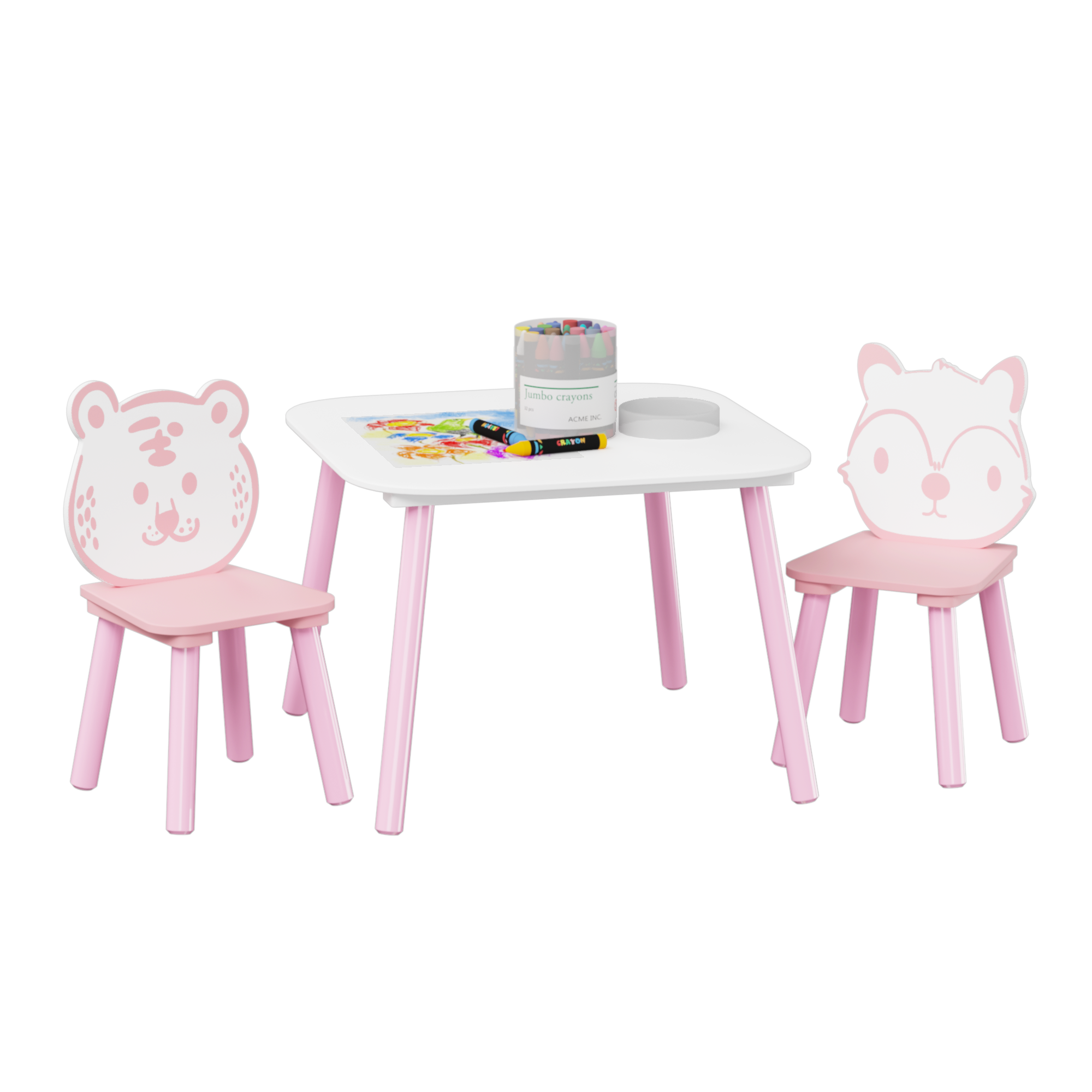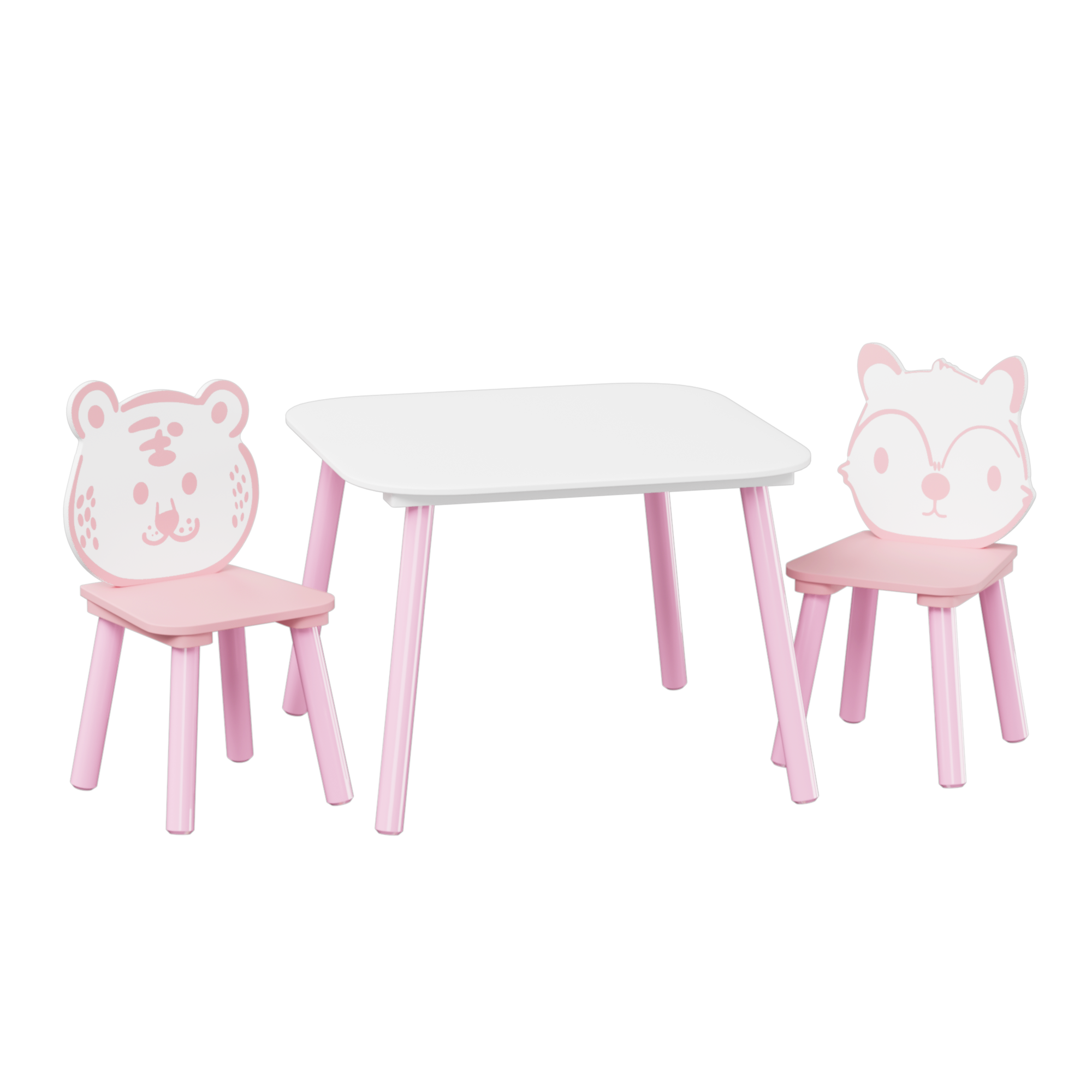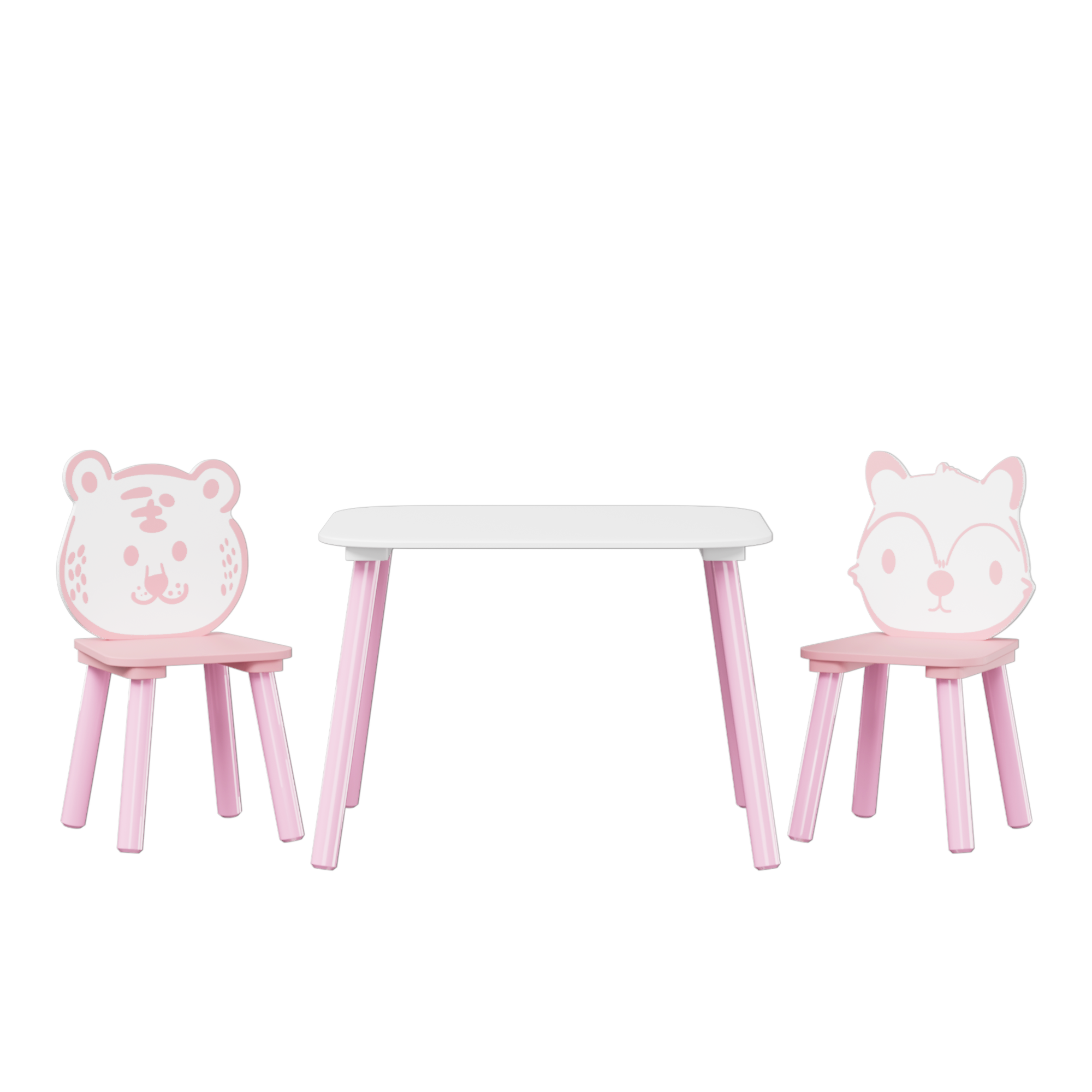 • Appearance:This set features a charming pink color scheme. The table is white with pink legs, complemented by two chairs that have cute animal - shaped backrests, one resembling a tiger and the other a fox.