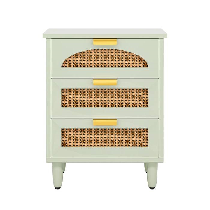 This Retro Green Wooden 3 Drawer Nightstand features a vibrant green finish, giving your bedroom a refreshing touch. Equipped with three spacious drawers, providing ample storage for your bedtime essentials. The unique gold handles add an extra level of luxury and elegance to the overall design. Detailed with modern farmhouse rattan accents, this bedside table brings a stylish, timeless charm to any bedroom decor.